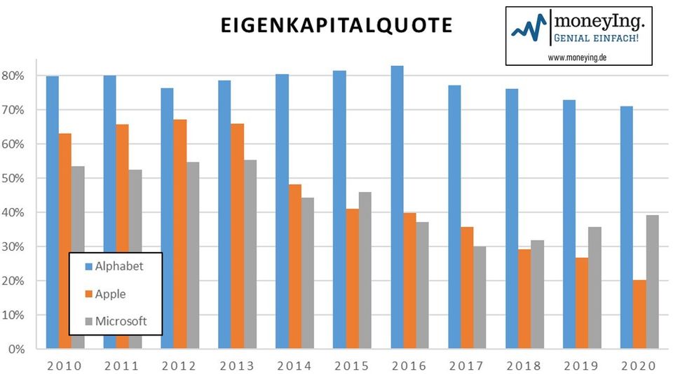Ein Blick auf die Eigenkapitalquoten für das Jahr 2020 verrät, dass Alphabet mit einer Quote von 71,2% deutlich führend ist vor Microsoft mit 39,3%. Apple hingegen kommt auf nur 20,2% [2,4,16,17]. Alphabet steht somit extrem solide da.