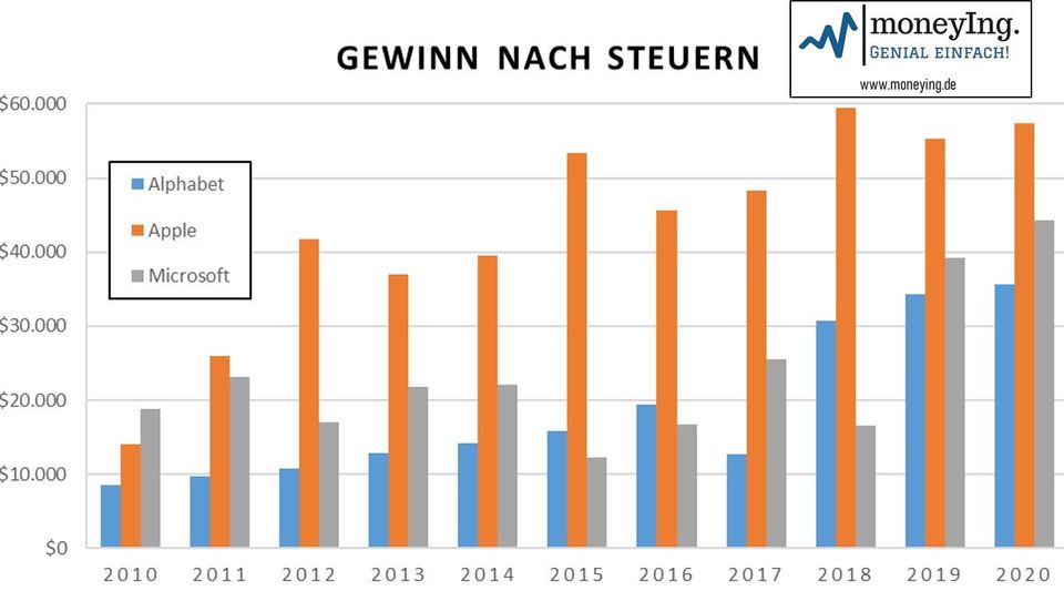 Bei einer Betrachtung des Gewinns nach Steuern dominiert Apple erneut mit einem Gewinn von 57 MRD USD für 2020, gefolgt von Microsoft mit 44 MRD USD und Alphabet mit ca. 35 MRD USD. Zwar schwankten die Gewinne, wie bereits erwähnt, stärker als die zugrundeliegenden Umsätze, konnten sich dennoch prächtig entwickeln: Im Durchschnitt legten die Gewinne von Apple und Microsoft seit 2010 um 18,8% bzw. 18,6% zu, während der Gewinn von Alphabet um mehr als 21% zulegte – jährlich, wohlgemerkt.