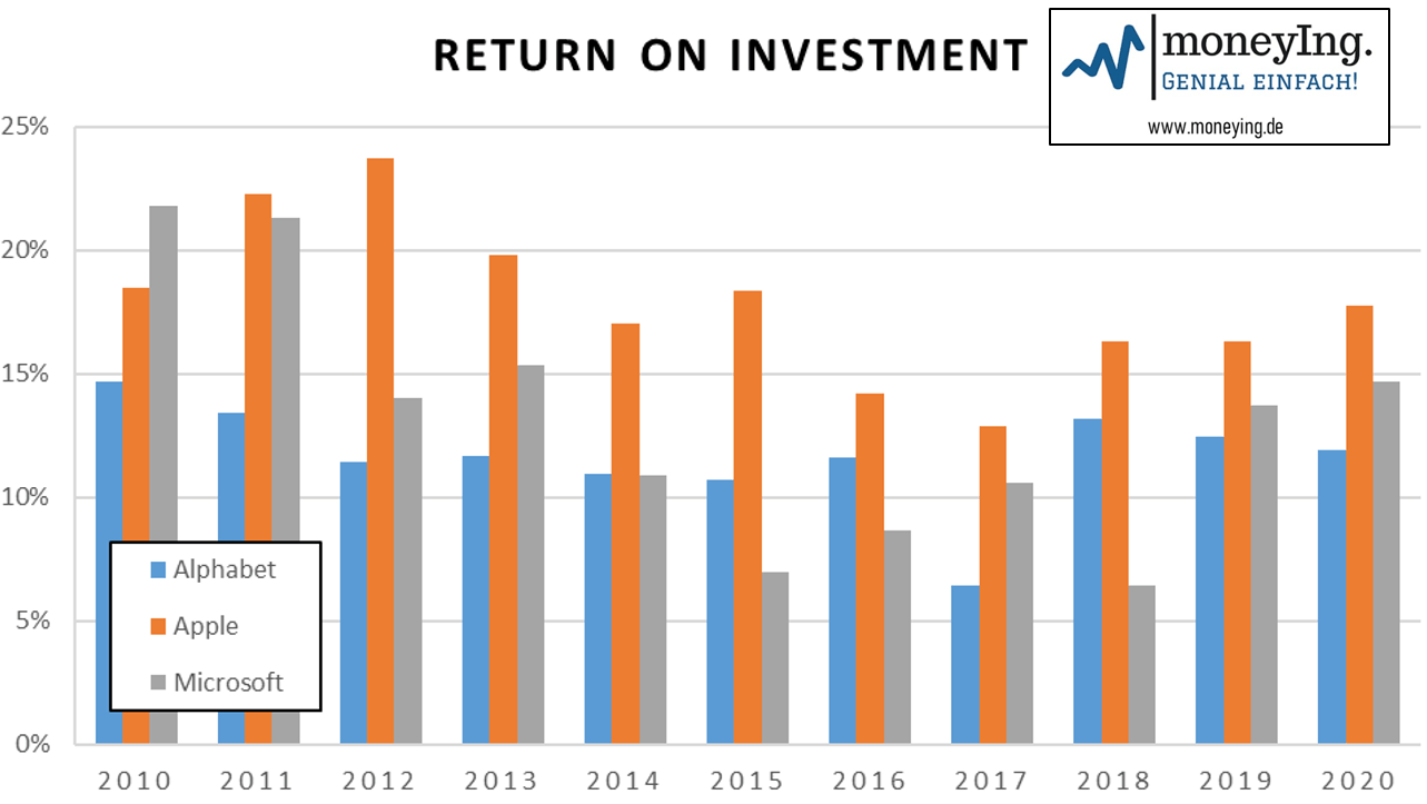 Für das Geschäftsjahr 2020 erreicht Apple ein ROI von 17,7%, Microsoft von 14,7% und Alphabet 11,9% [2,4,16,17]. Um es klar zu sagen: Das alles sind absolut phänomenale Werte
