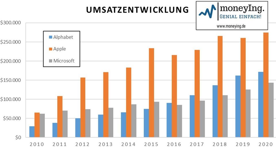 Bei einem Blick auf die Umsatzentwicklung unseres Dreigestirns bestehend aus Apple, Alphabet und Microsoft fällt direkt auf, dass im Geschäftsjahr 2020 Apple das Trio mit einem Umsatz von 274 MRD USD anführt, gefolgt von Alphabet mit 171 MRD USD und Microsoft mit 143 MRD USD. Erstaunlicher Weise konnten alle drei Unternehmen ihren Umsatz gegenüber dem Vorjahr mindestens