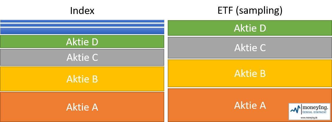 Auf der rechten Seite ist der ETF dargestellt, der mittels Sampling den Index nachbildet. Die blauen Anteile werden hier also vernachlässigt und Aktien dieser Unternehmen nicht für den ETF gekauft. Stattdessen werden die Anteile der Unternehmen A, B, C und D proportional erhöht.