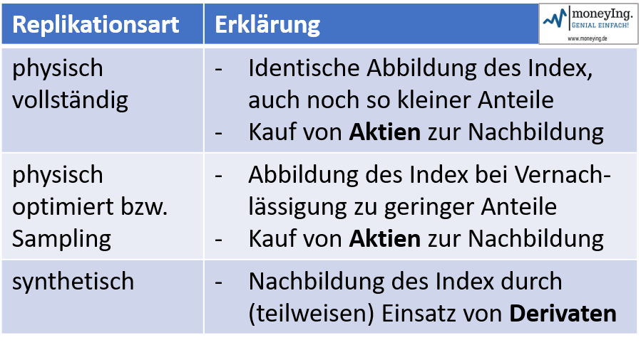 Es kann also vorkommen, dass beispielsweise einige Unternehmen des MSCI World Index nicht berücksichtigt werden und der ETF somit nicht alle etwa 1600 Unternehmen enthält. Dennoch ist diese Replikationsmethode bei großen Indizes enorm sinnvoll, da der ETF dennoch zu mehr als 99% den Index genau nachbildet.