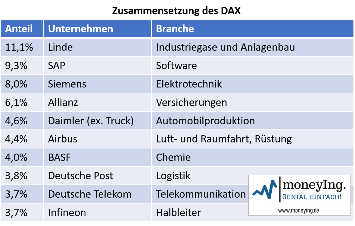 Ein ETF macht also genau das gleiche: Werden beispielsweise 10.000€ in einen DAX-ETF investiert, so fließen davon 1.110€ (11,1%) in Aktien von Linde, 930€ (9,3%) in SAP, 800€ (8,0%) in Siemens, 610€ (6,1%) in Allianz und 460€ (4,6%) in Aktien von Daimler. Die restlichen 6080€ bzw. 60,8% werden auf die restlichen 35 DAX-Unternehmen wie Airbus, BASF oder Infineon entsprechend ihrer Gewichtung verteilt.