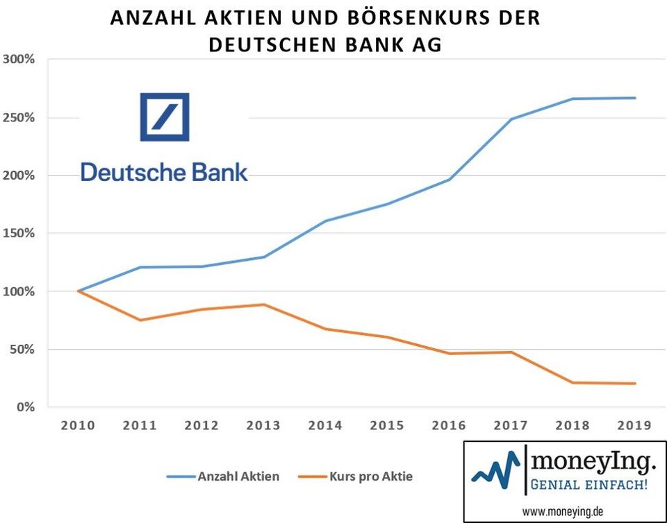 Besonders deutlich wird es am Beispiel der Deutschen Bank. Im Geschäftsjahr 2010 war das Kapital auf 790,8 Mio. Aktien aufgeteilt und der Jahresschlusskurs der Aktie lag bei 33,25€. Ende 2019 war das Kapital bereits auf 2110,0 Mio. Aktien gestückelt, was in etwa einer Verwässerung um den Faktor