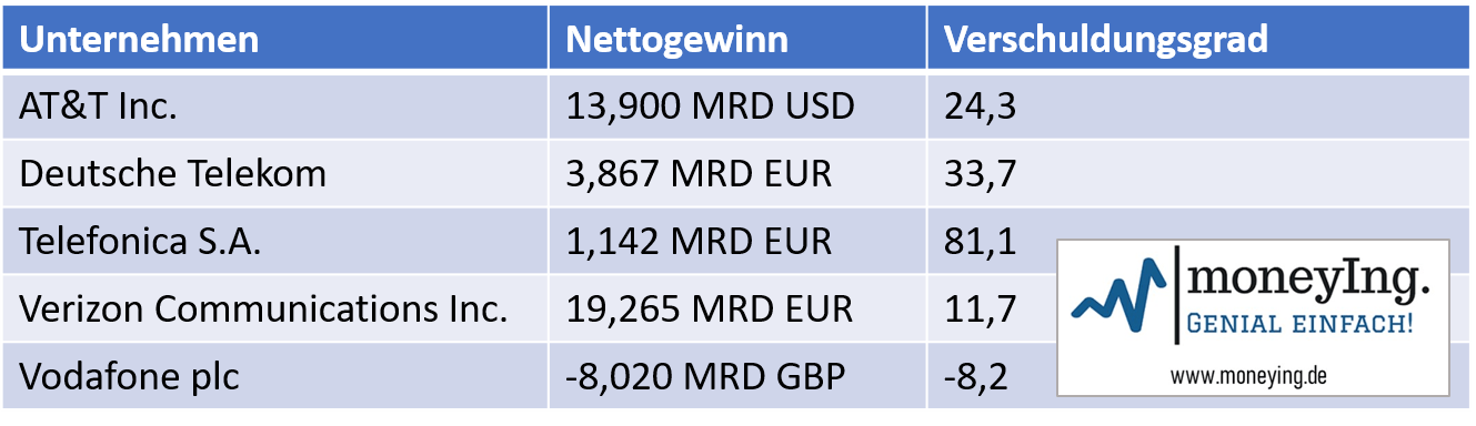 Anhand der Tabelle ist zu sehen, dass der spanische Telefónica Konzern über 80 Jahresgewinne vollständig abführen müsste, um seine Schulden zu begleichen. Bei der Deutschen Telekom sind es immerhin etwa 34 Jahresgewinne. Beides sind sehr hohe Werte. Einzig der US-amerikanische Verizon Konzern kommt auf einen Verschuldungsgrad von ca. 12, was als angemessen betrachtet werden kann. Bei Vodafone hingegen ist die Berechnung unsinnig, da in 2019 ein Verlust von ca. 8 MRD GBP erzielt wurde und der Verschuldungsgrad somit negativ ist.
