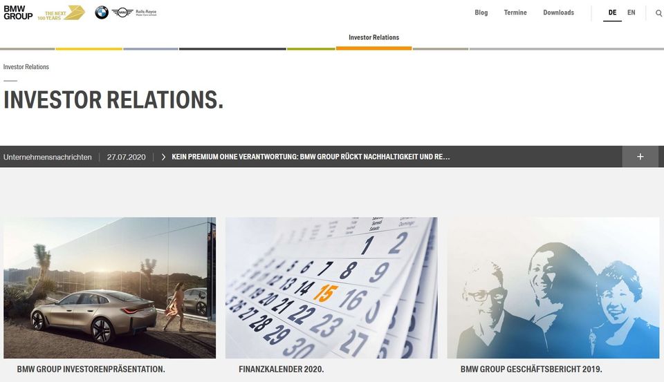googelst. Wenn Du also beispielsweise „BMW Investor Relations“ eingibst, landest Du auf derjenigen Unterseite der BMW-Homepage, die an Investoren gerichtet ist. Hier werden seitens des Unternehmens offizielle Informationen wie Geschäftsberichte, Aktionärsstruktur, Finanzkennzahlen aber auch Angaben über die Höhe der Schulden und deren Fälligkeit sowie wichtige Termine für Veröffentlichung von Geschäftsergebnissen zusammengefasst. Sehr schön sind die Investorenpräsentationen, die prägnant das Geschäftsmodell sowie finanzielle Kennzahlen darstellen. Für jeden Investor ist die Investor Relationsseite ein absoluter Pflichtbesuch