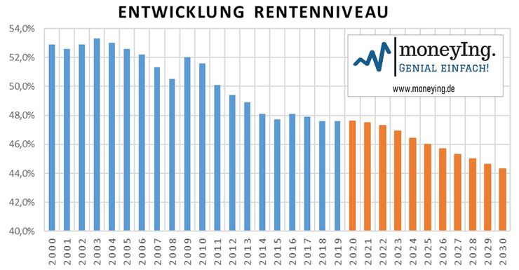 und wird bis 2030 auf 44,3% sinken [3]. Für die Zeit danach sind die Prognosen ungenau, doch ein weiterer Abfall auf unter 40% ist sehr wahrscheinlich, da zukünftig jedem Erwerbstätigen mehr Rentner gegenüberstehen [4]. Zudem steigt der steuerpflichtige Anteil der Rente kontinuierlich an, was dazu führt, dass Renten ab dem Jahr 2040 vollständig versteuert werden müssen [5]. Die folgende Grafik fasst die tatsächliche (blau) und prognostizierte (orange) Entwicklung des Rentenniveaus zusammen.