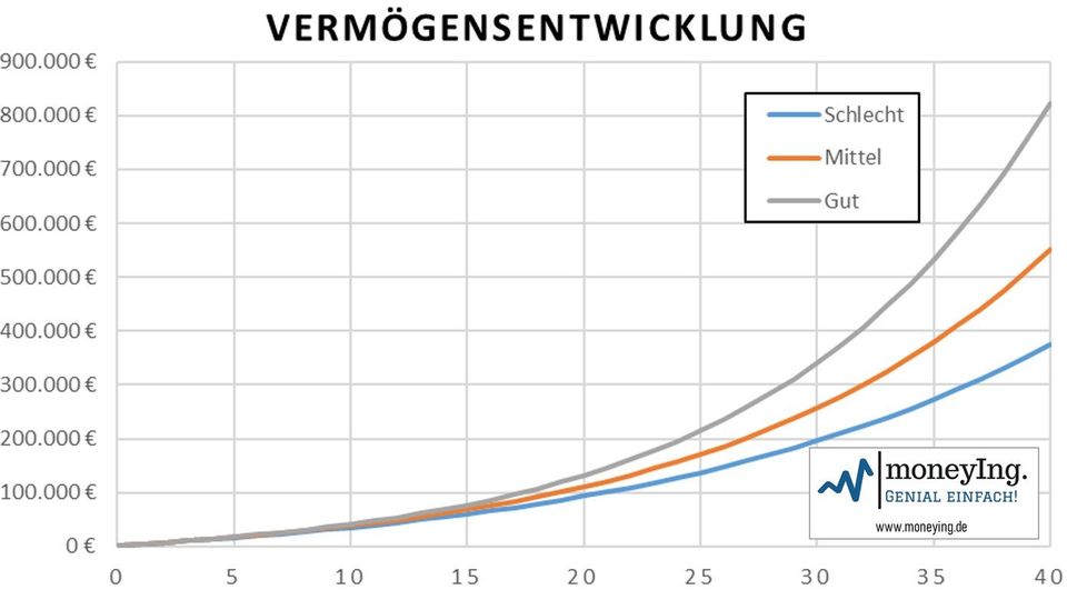 Um zu verdeutlichen, wie groß der Einfluss der erzielten Rendite ist, habe ich im Bild für die monatliche Sparrate von 200€ drei Szenarien unterschieden. Bei „schlecht“